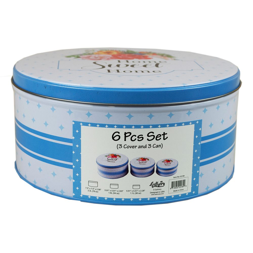 Guarde sus delicias, tés y más favoritos en estos botes redondos de hojalata en cuatro colores surtidos. El bote viene en un juego de tres en colores y diseños variados. Vienen empaquetados en una bolsa de plástico con los tamaños más pequeños encajados. Los botes de hojalata miden aproximadamente 7.5" x 7.5" x 2.26", 5.91" x 5.91" x 2.83", 5.51" x 5.51" x 2.28" de tamaño. Botes redondos de hojalata en cuatro colores surtidos.